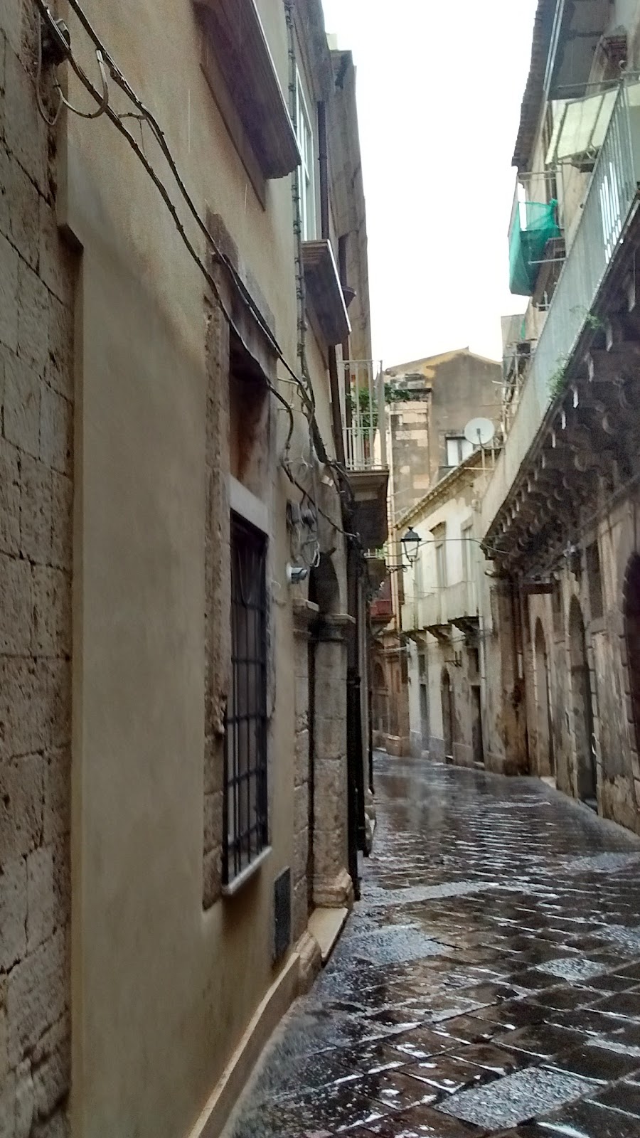 Well, Syracuse is definitely shy - it was our first completely rainy day. With riposo closures in mind, we drove through pouring rain and water-slewing lakes to get there well before 10:00. We parked just outside of Ortigia (the island part of the city), and walked around in an on-again-off-again drizzle.